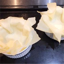 春巻きの皮を互い違いになるように2枚合わせにココット皿の中に敷き詰める。