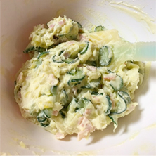 粗熱がとれたら、きゅうり、ハム、マヨネーズ、ヨーグルトを加えサックリ混ぜる。