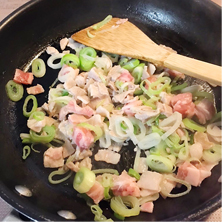 フライパンにサラダ油を熱し、豚肉を炒め、火が通ったら長ネギを軽く炒める。